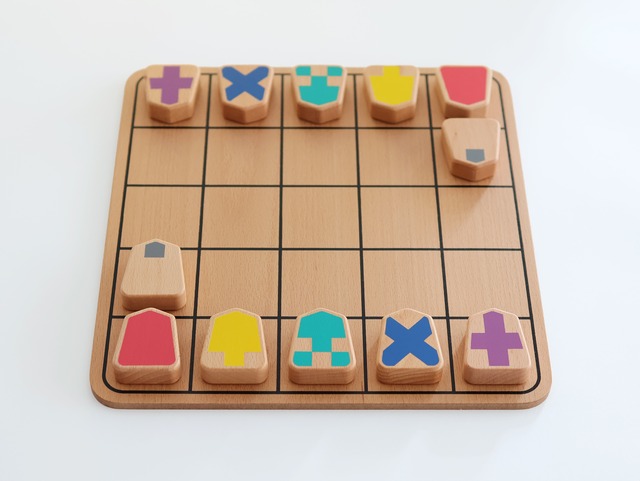 SHOGGY-ショギー-は5五将棋(5×5マスのミニ将棋)を元にしたゲームです。 コマの動きが模様で表現されていて、それぞれの動き方を覚えなくても始めることができます。 相手側の動きも読みやすく、直感的にゲームを進めることができ、将棋をやったことのない人でもすぐに楽しむことができます。 対象年齢 6歳~ セット内容 コマ12個、ボード1枚、説明書1枚 材質 天然木 生産国 ベトナム ※商品写真と実際の商品は色味が異なる場合がございます。 また、木目や塗装色は商品ごとに多少変わりますので、予めご了承ください。 ※商品ご購入後、ご住所の番地以降は必ず「○丁目」始まりでご入力ください。 ※ラッピングの対応は致しかねますので、予めご了承ください。
