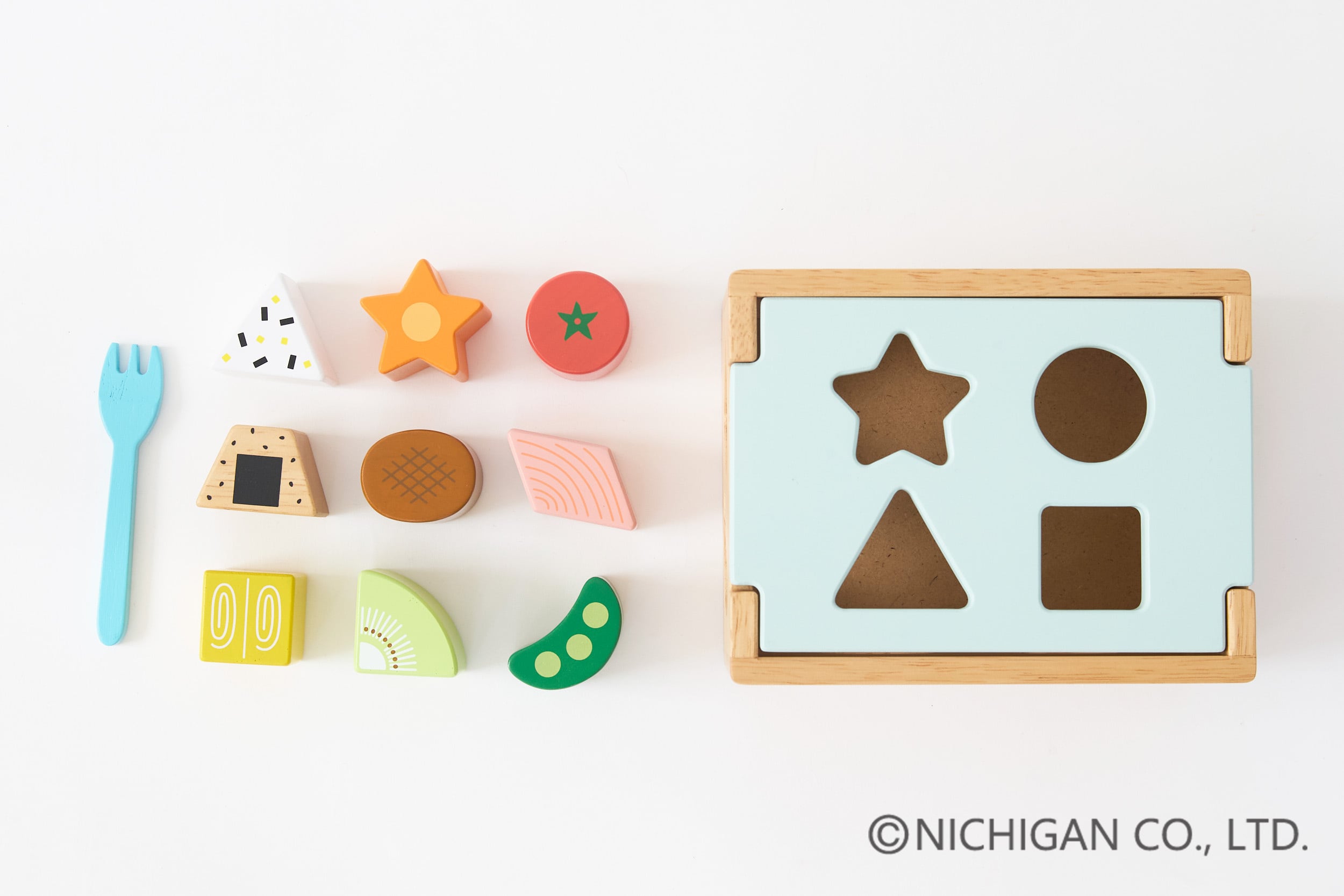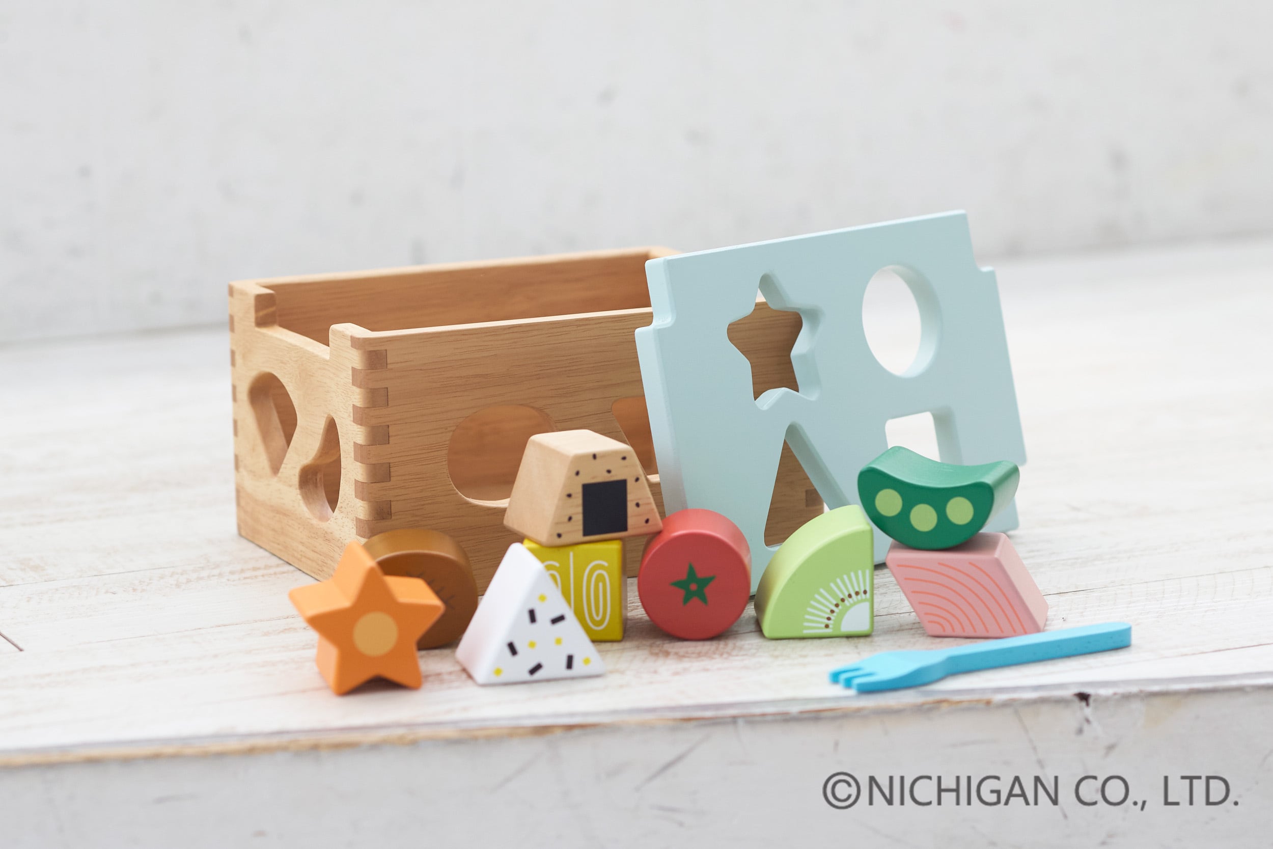 スタンダードな型はめパズルのブロックを、食材に見立てたパスルボックスです。