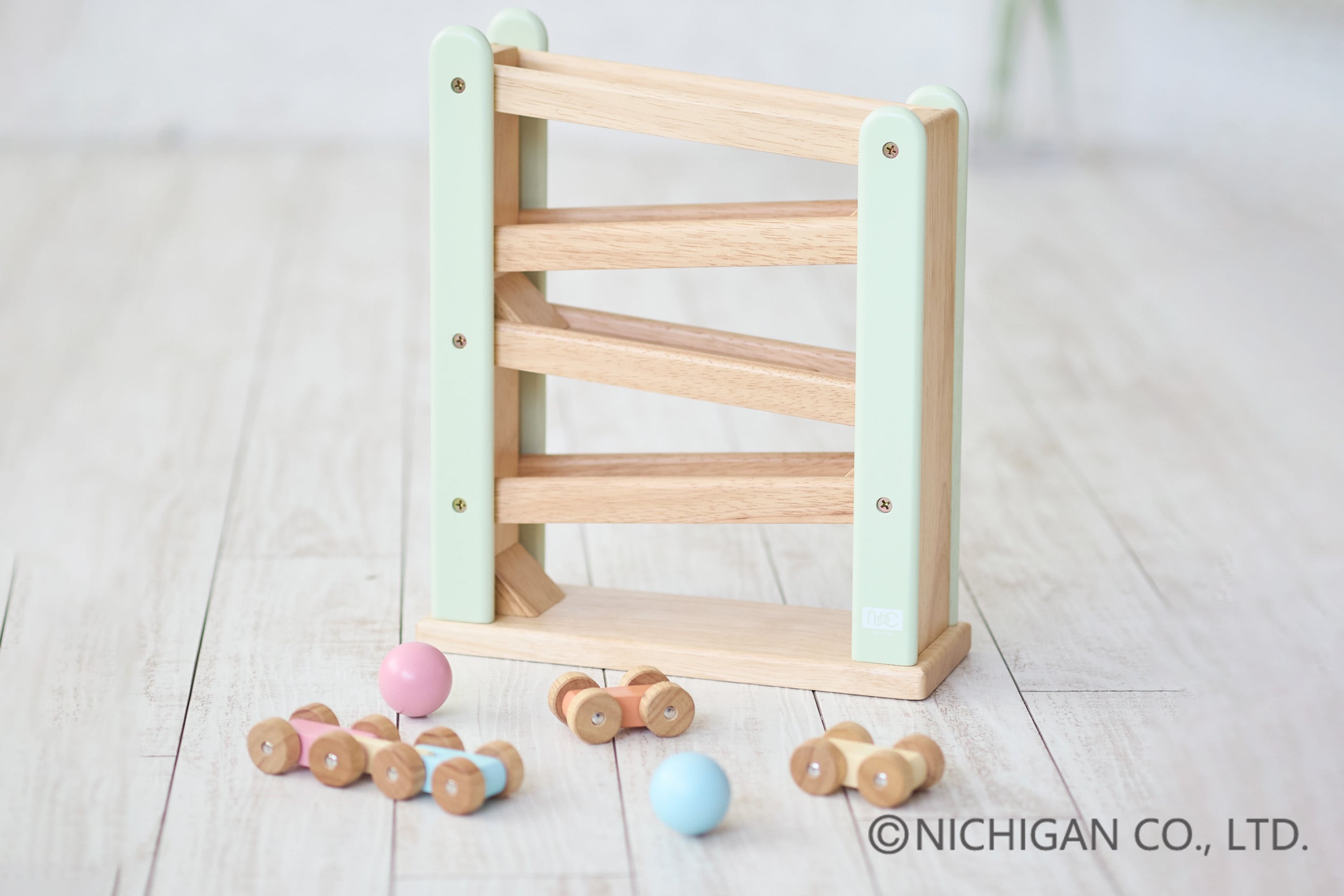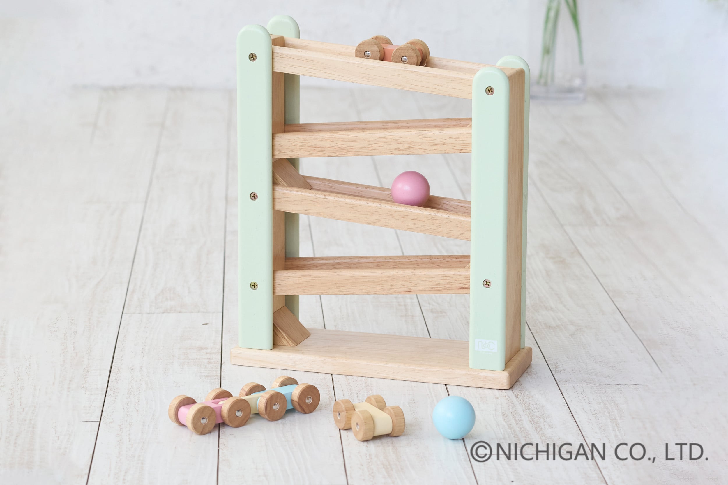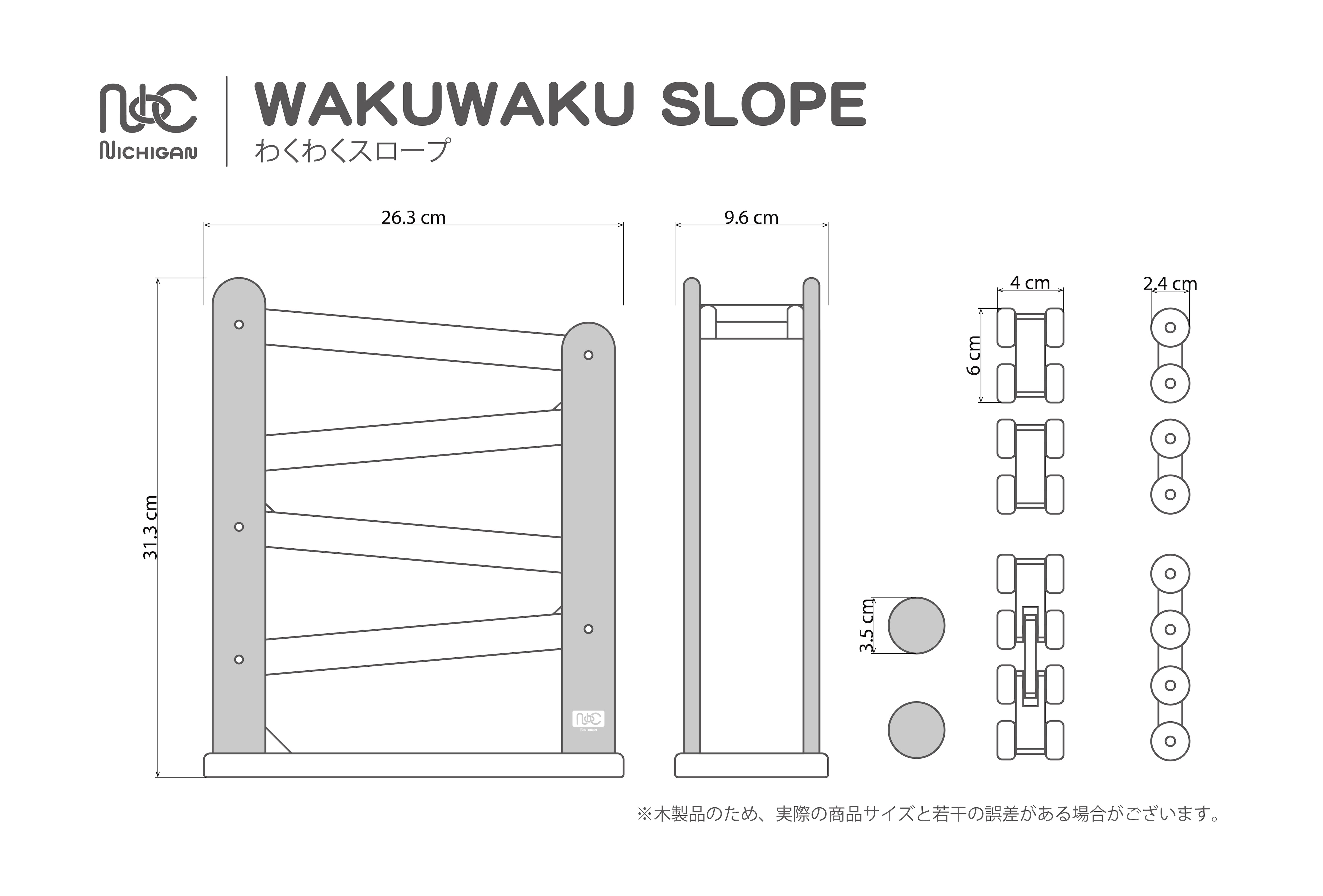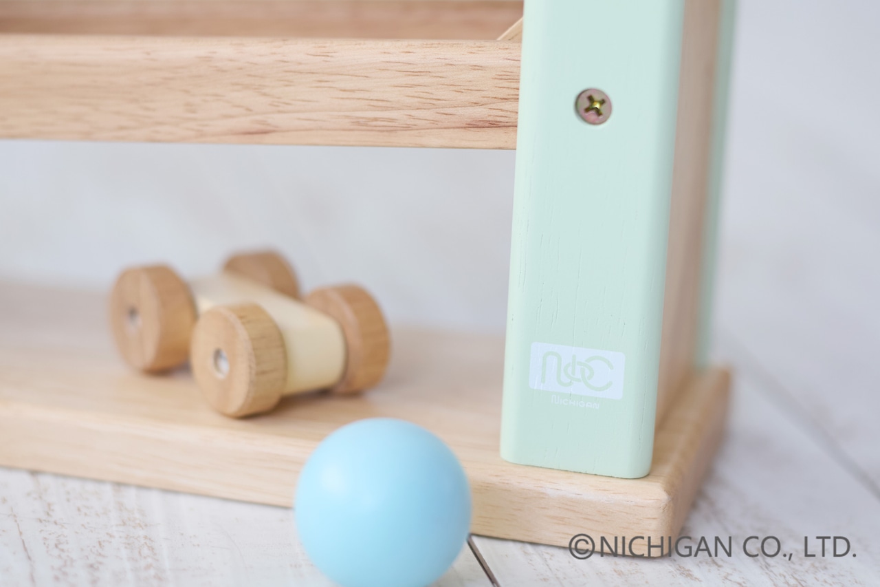 車やボールがスロープを滑り落ちる際に木の優しい音と個性的なリズムを生み出す点が特徴で、お子様の聴覚を刺激し、遊びを通して音の違いやリズム感の発達を促します。