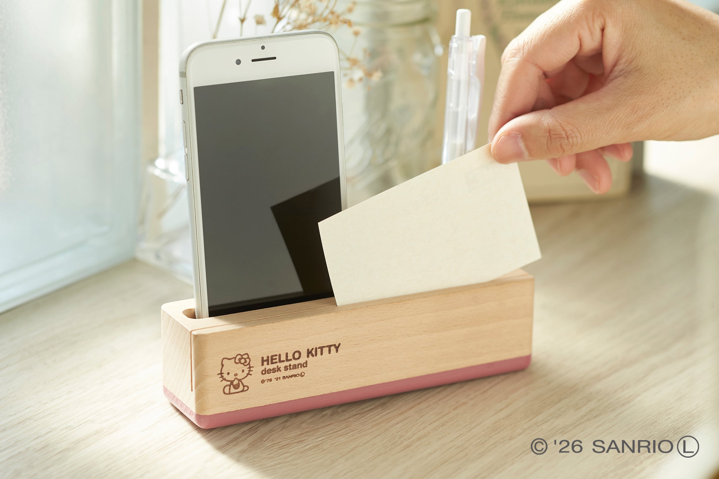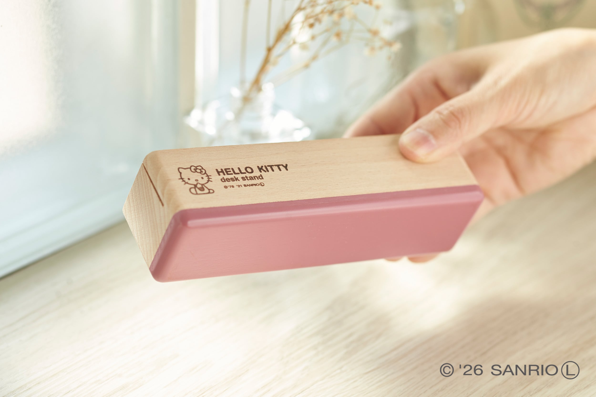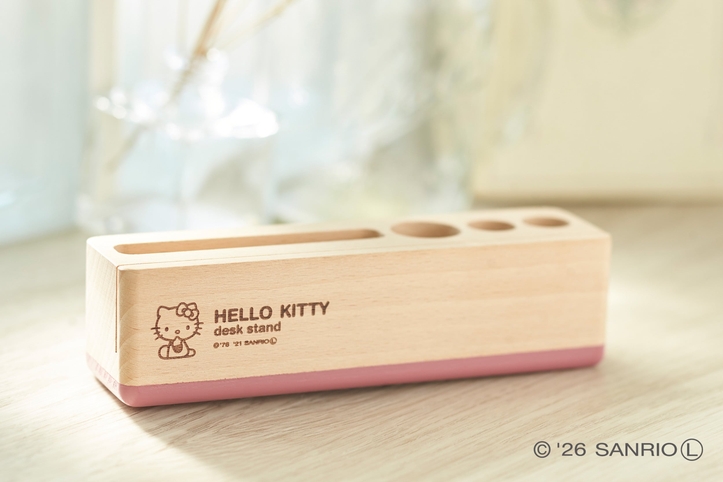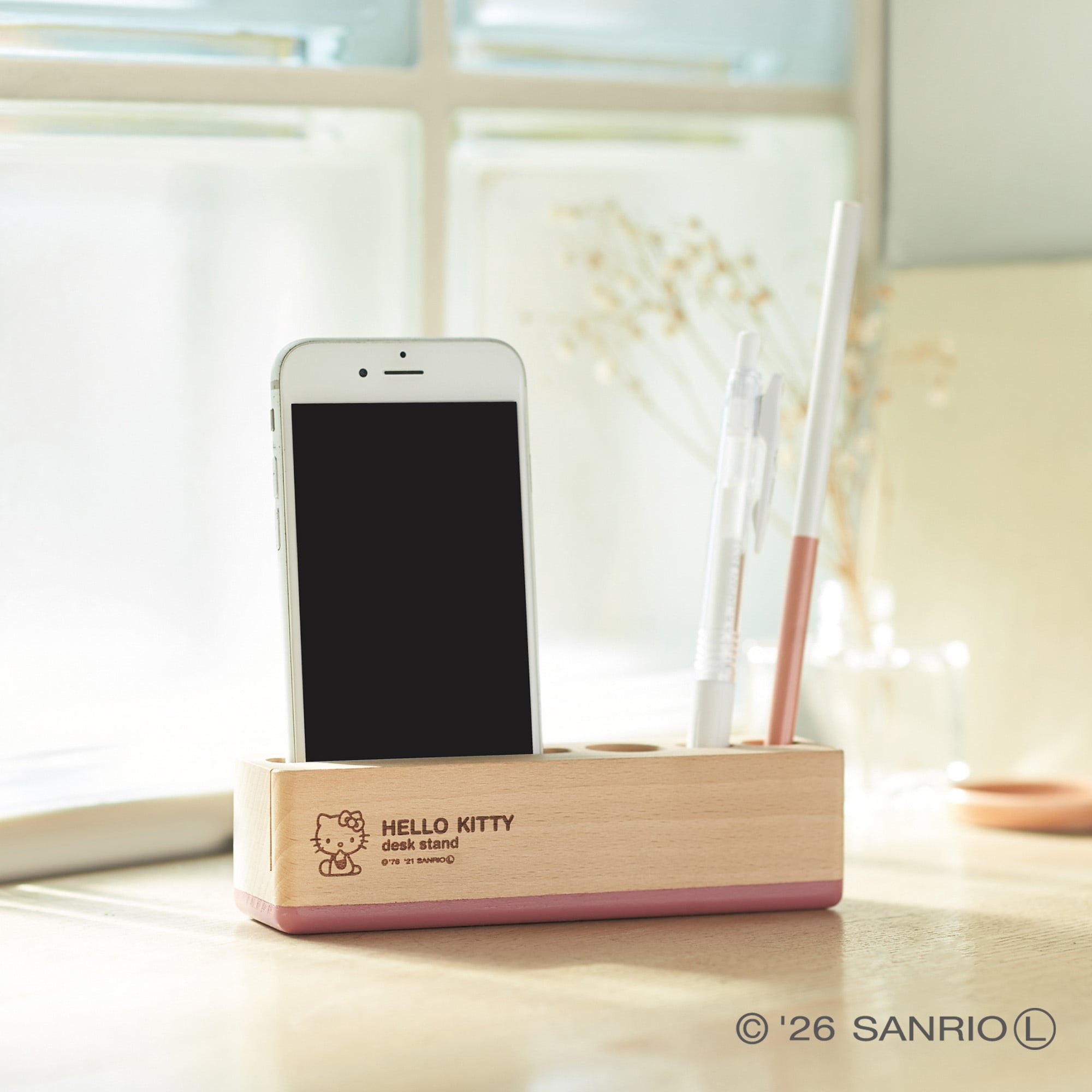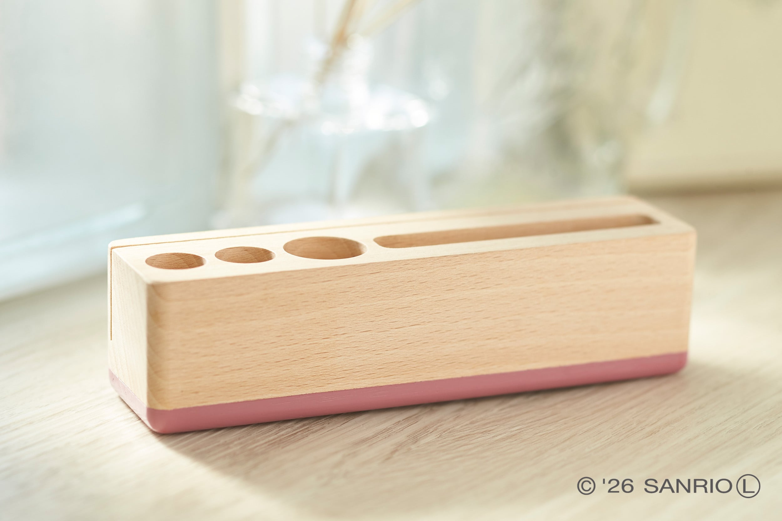 シンプルな形状に、スモーキーピンクのカラーリングが映えるデスクスタンド。スマホやペン、印鑑や名刺などを一箇所にまとめることのできる便利グッズです。イラストやロゴは焼印加工で、ナチュラルな印象です。